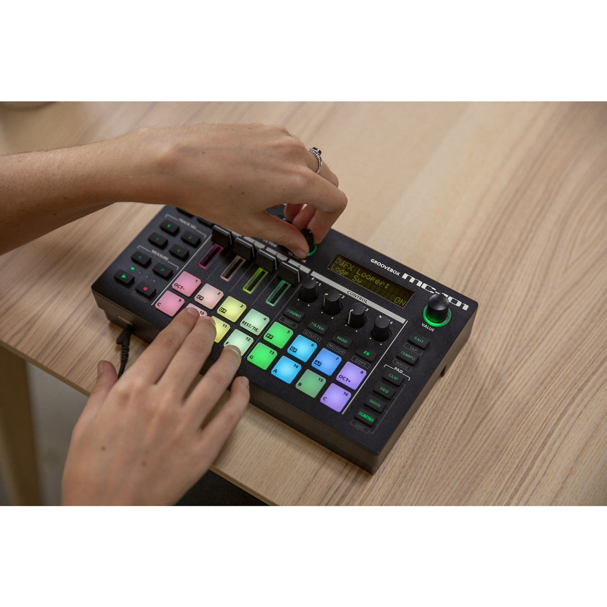 Produce and perform music anywhere, anytime—without clutter or complications. The MC-101 GROOVEBOX has all the high-quality sounds, sequencing, and effects of the professional MC-707, in a compact four-track version that’s go-everywhere portable. Get started with an inspiring collection of ready-to-go sounds and patterns, or easily create your own. Craft a unique style by importing custom sounds and loops that sync to tempo. And you can perform with the MC-101, triggering clips and shaping your sounds with direct, hands-on control.