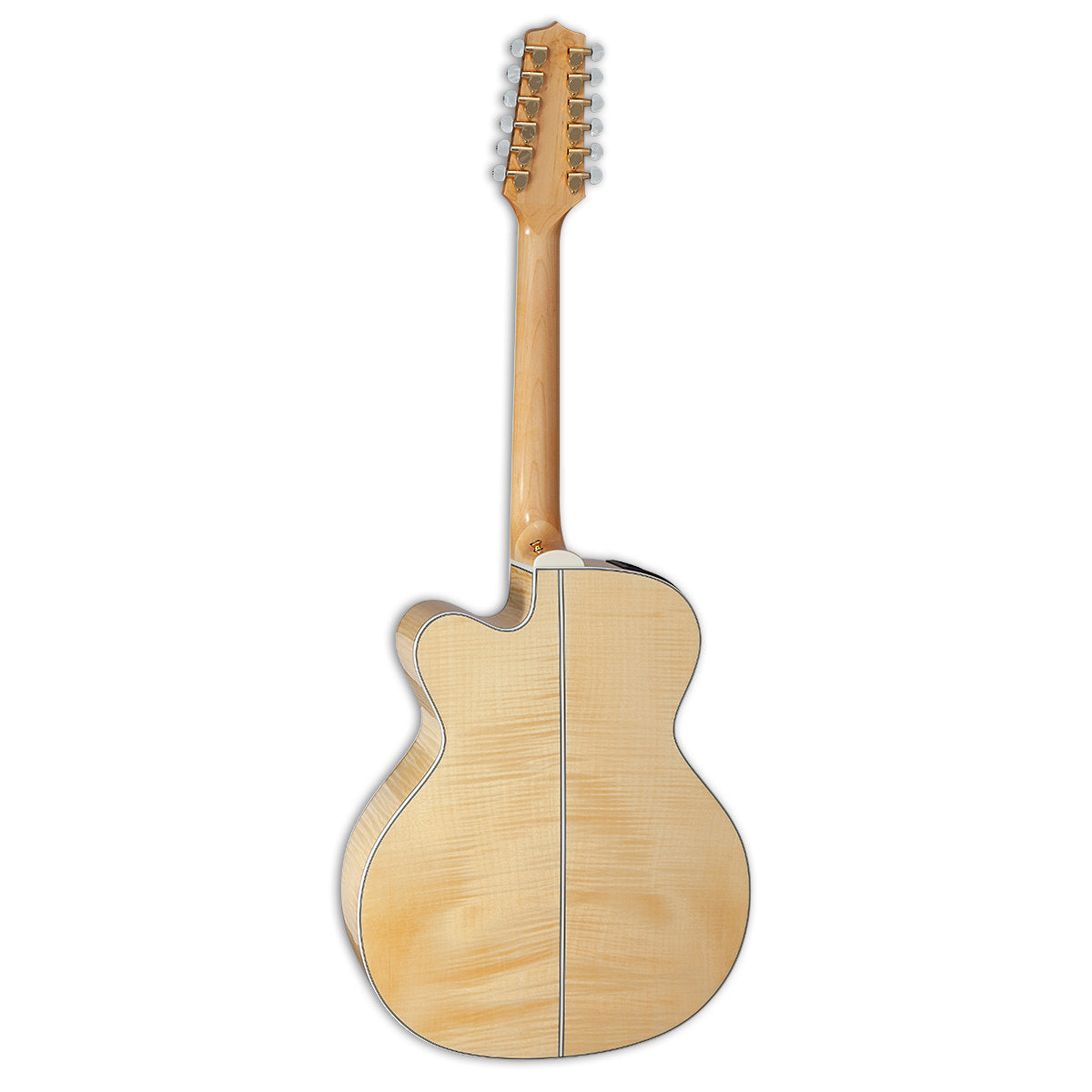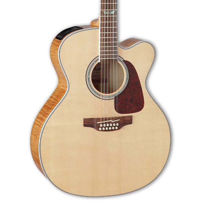 Featuring a solid spruce top and flame maple back and sides, the GJ72CE-12 produces all the lush, robust sound that players expect from a jumbo 12-string guitar. The slim mahogany neck and 12”-radius bound laurel fingerboard provide great feel and playability, while the onboard Takamine TK-40D preamp system gives you a built-in tuner, three-band EQ and gain controls, mid contour switch, notch filter and EQ bypass switch for the ultimate in versatility and sound quality.