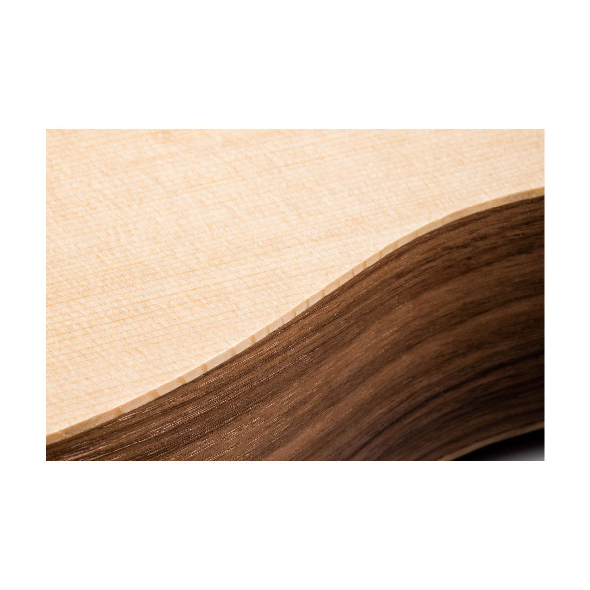Sound: Taylor uses layered woods for the back and sides of some of Taylor's guitars for their blend of sound quality, durability, and affordability. Layered wood construction also enables Taylor to preserve tonewood resources. Although layered wood guitars won’t yield quite the same level of tonal complexity as an all-solid guitar, all are paired with a solid wood top to produce a rich, responsive voice that will continue to improve with time and extended play. Layered walnut provides a strong backbone for Taylor's 100 Series, adding subtle touches of high-end sparkle together with midrange presence. An outer layer of walnut is overlaid onto a poplar core (with a layer of sapele on the other side). The layering process also allows Taylor to bend an arch into the back for extra strength and produces a durable that travels well.