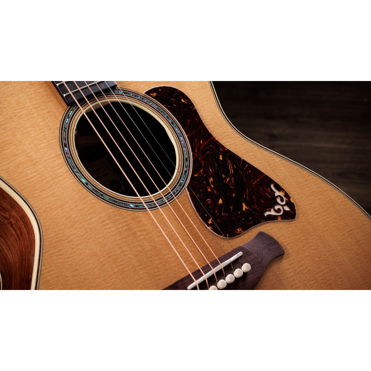 Designed by Andy Powers to produce a new voice rich with seasoned warmth and power, the new Gold Label K14e introduces players to a new kind of sound inspired by the classic sounds of the vintage era. This model features a new body shape Taylor is calling the Super Auditorium, which resembles their Grand Auditorium but with slightly wider contours that help coax out more volume and greater low-end presence. Hawaiian koa back and sides paired with a torrefied Sitka spruce top generate stunning midrange power and richness complemented by warmth and depth usually only found in older, more played-in guitars. Inside, a fanned variant of Taylor's V-Class bracing helps add even more volume and sustain while maintaining focus and clarity even at the highest volumes. A new long-tenon neck joint adds to the litany of innovations, improving sonic transfer for greater resonance and easy adjustability. The Gold Label K14e sports a striking appointment package headlined by Taylor's new Continental inlays, a new pickguard design, a Honduran rosewood bridge, grained ivoroid trim, and antique chrome Gotoh 510 tuners with ebony buttons, while a full-body gloss showcases koa's natural highlights and variegation. This model ships with LR Baggs Element VTC electronics and a deluxe hardshell case with a British Cocoa exterior.