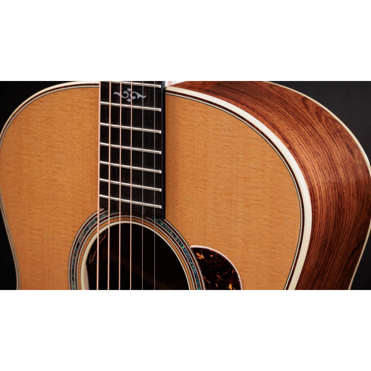 Taylor's new Super Auditorium body shape and fanned V-Class bracing combine with koa's midrange sparkle for a powerful sound with unmatched focus and clarity.