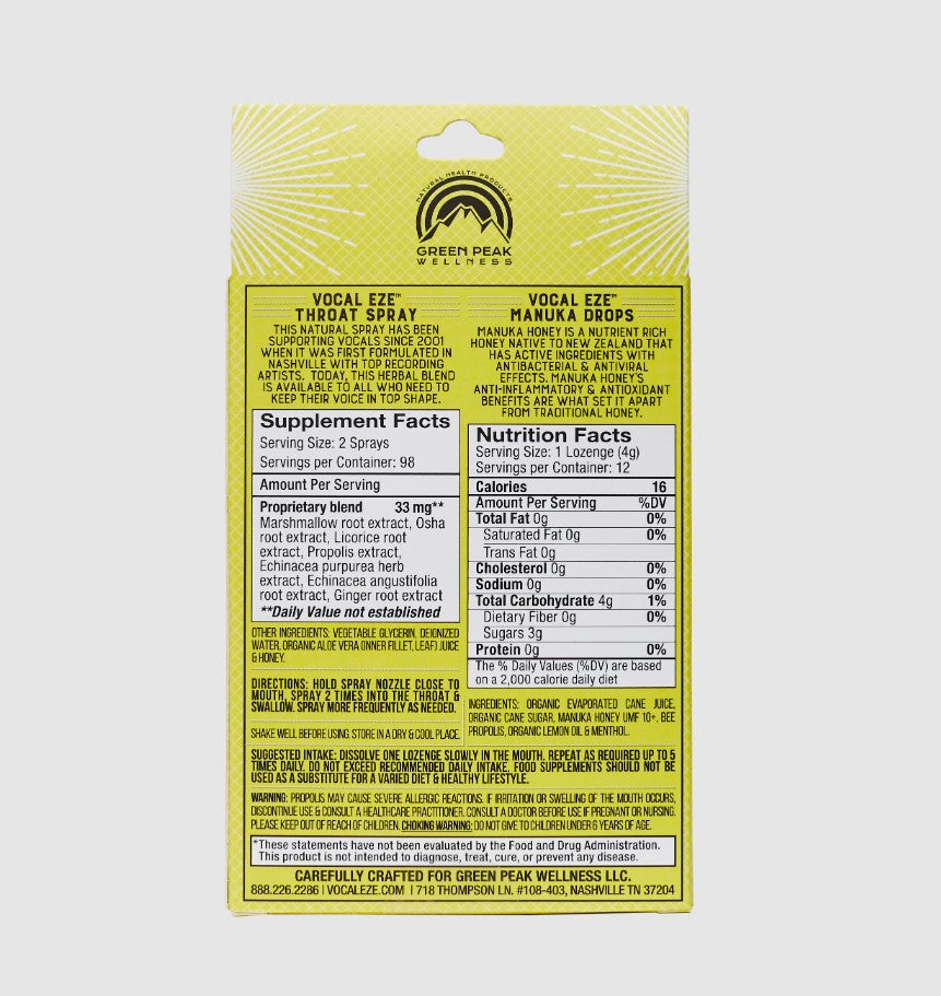 Each Vocal Eze Voice Saver Kit comes with a 1oz. bottle of the spray that started it all, as well as a pack of 12 heavenly Manuka Honey Drops. Throw a kit in your gig bag, travel case, backpack, whatever and you will have delicious, cooling, moisturizing vocal power anywhere, any time.